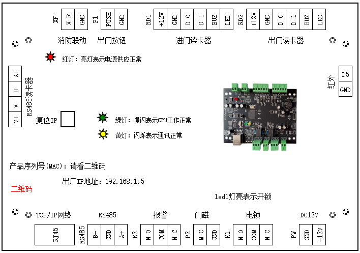 1、通讯配置丰富:RJ45网络端口1个,TCP/IP通讯SOCKET多线程4路,RS485通讯2路,TTL(RX,TX)2路,可扩展RS232、RS422、CAN、ISP、IIC等等;WG格式读卡器进门2套,RS485格式读卡器进出2个;