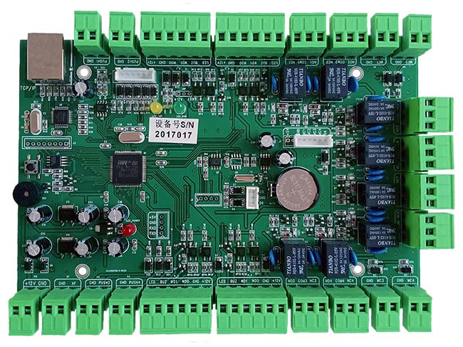 网络四门控制器,采用国产中科芯CKS(或美国STM公司)32位ARM7主控单片机,进门或出门刷卡/出门按钮开门,控制四个门的门锁,内部运行RTOS实时操作系统和FAMS2存储管理系统. |